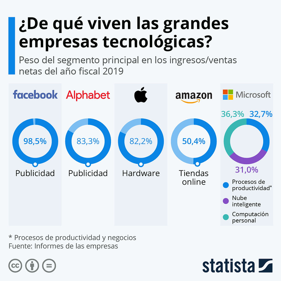 Fuentes de ingresos de las grandes tecnológicas año 2019. Fuente: Statista